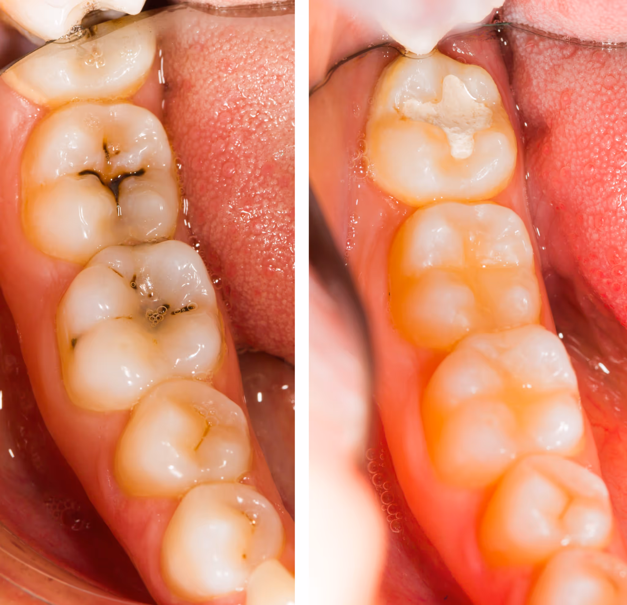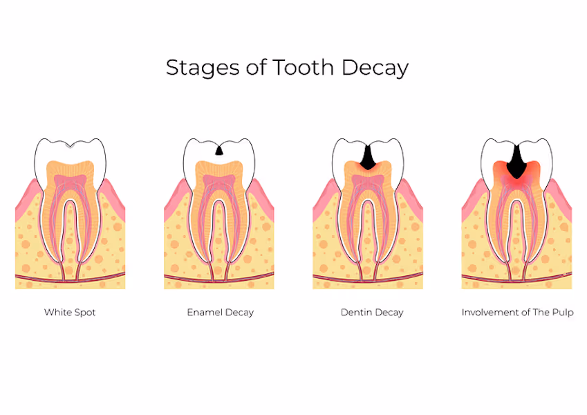 The earliest sign of tooth decay appears as small white spots on the surface of the tooth. These areas indicate mineral loss beneath the enamel, a process known as demineralization. At this stage, no permanent damage has occurred. With excellent oral hygiene and fluoride treatment, enamel can be strengthened and the process may be reversed before a filling is needed.